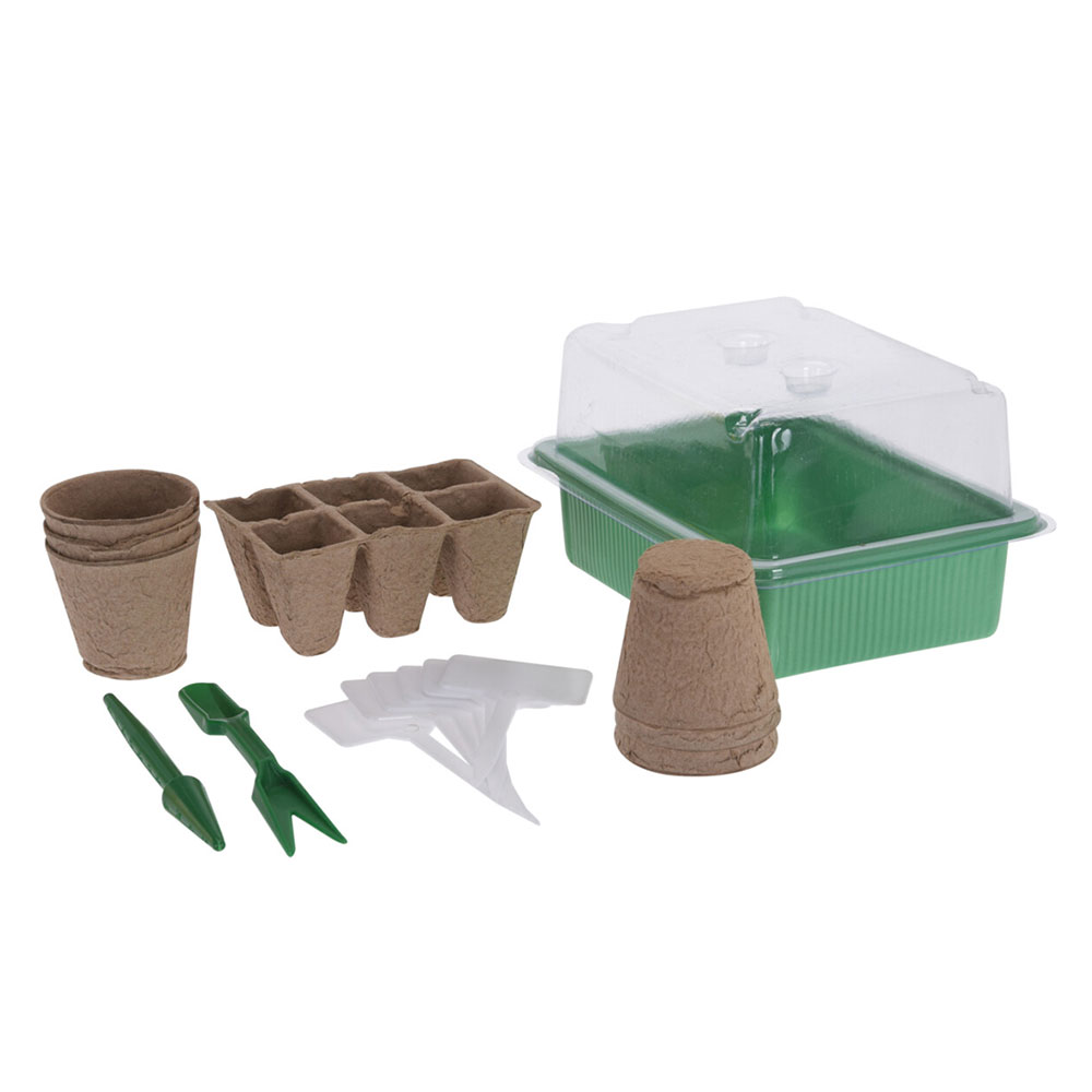 Mini seră pentru creșterea răsadurilor. Dimensiuni aprox. 20 x 6 x 14 cm cu acoperiș. Conține: 6 ghivece, 1 tavă, 6 etichete și 2 ustensile de plantare.