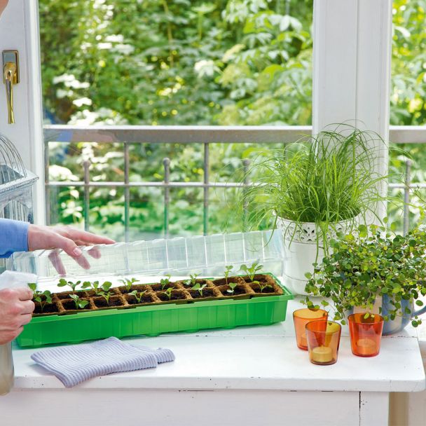 Conţinutul setului: 1 buc Această răsadniță face posibilă obținerea de răsaduri în cele mai bune condiții, datorită orificiilor pentru aerisire și a canelurilor care dozează apa, astfel încât plantele beneficiaza doar de câtă apă au nevoie. Apa rezultată în urma evapotranspirației, de pe capacul răsadniței se va scurge înapoi în tăviță fără a ieși înafara ei. Nu uitați să aerisiți si sa udați in mod regulat. Răsadnița este produsă în Germania și este ideală pentru utilizarea în camere, pe terase, balcoane sau în sere. Dimensiuni: 54 x 15 x 12 cm. Conține 16 alveole separate, de 6 cm fiecare.