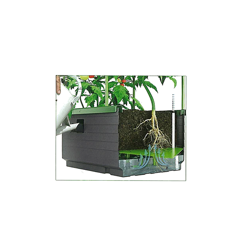 Mini grădină: ideală pentru terase și balcoane. Prevăzută cu sistem de dozare a apei. Este ideală pentru tomate, zucchini sau orice fel de plante cățărătoare. Dimensiuni 128 x 62 x 33 cm.