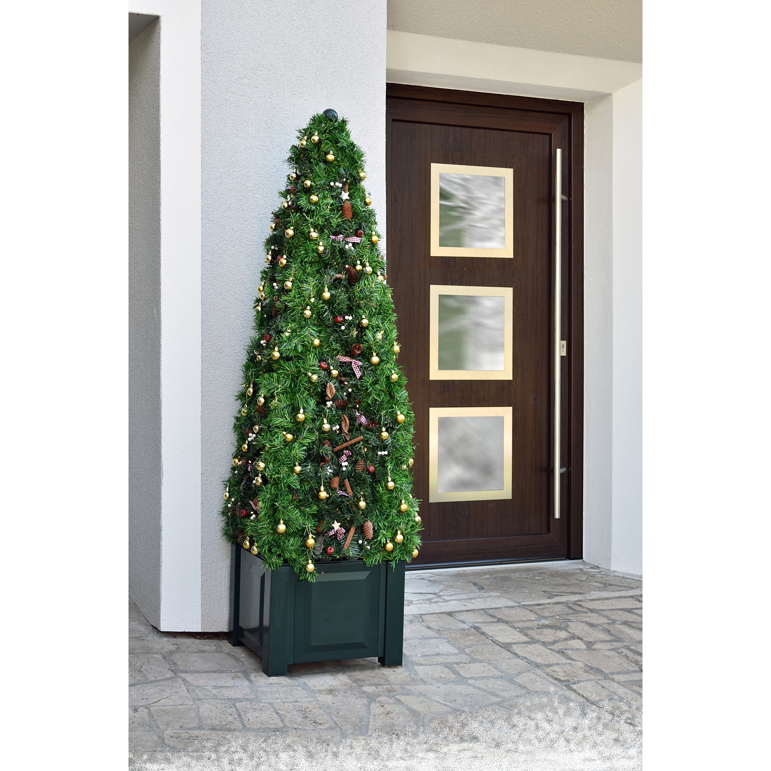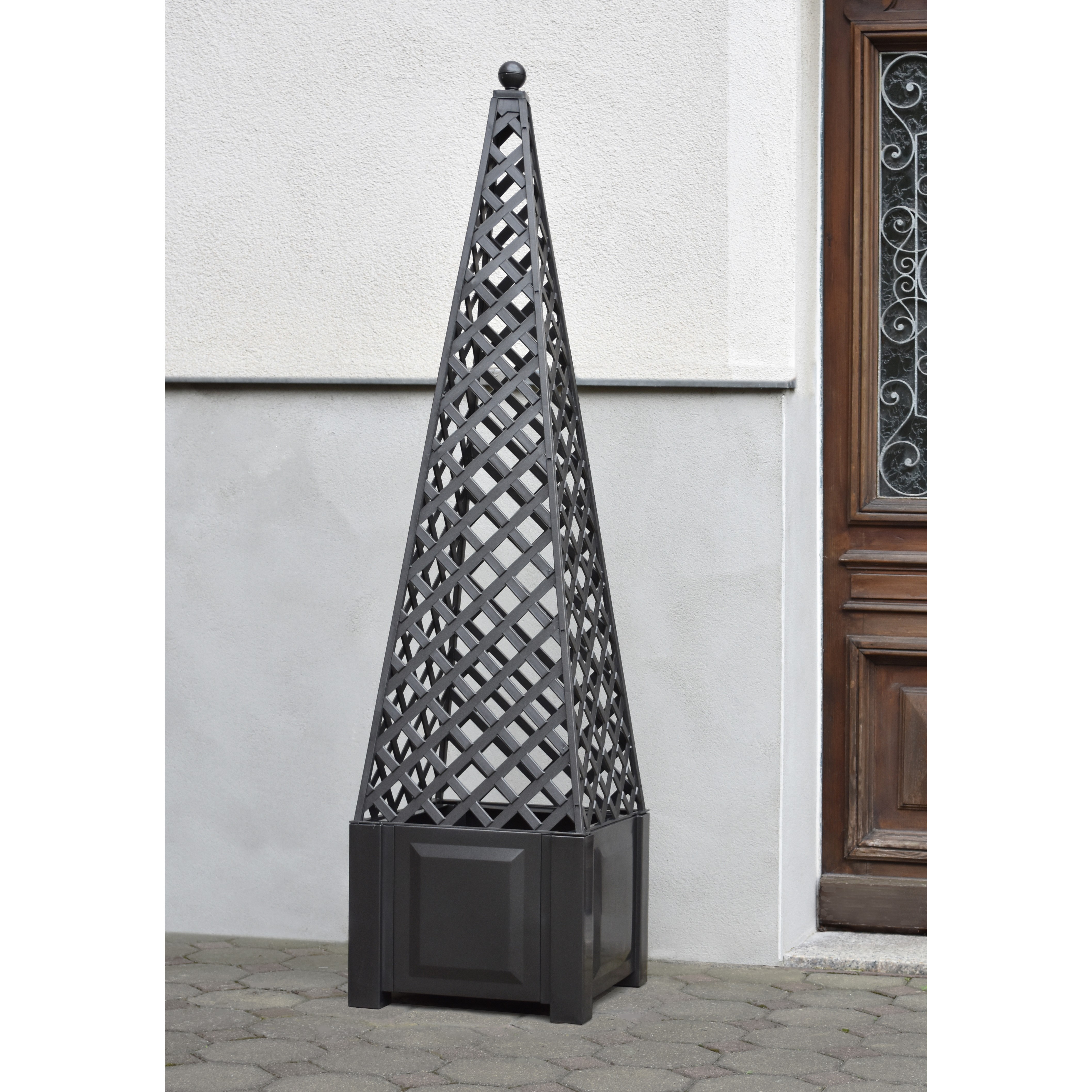 Conţinutul setului: 1 buc Este un element foarte decorativ, atât pentru grădini cât și pentru terase, este format dintr-o jardinieră dreptunghiulară și un un grătar sub formă de piramidă ideal pentru plantele cățărătoare. Vara se poate utiliza pentru plantele cățărătoare, iar iarna se poate decora sub formă de brad de Crăciun. Se livrează fără decorațiunile de Crăciun. Dimensiuni: 43 x 43 x 172 cm.