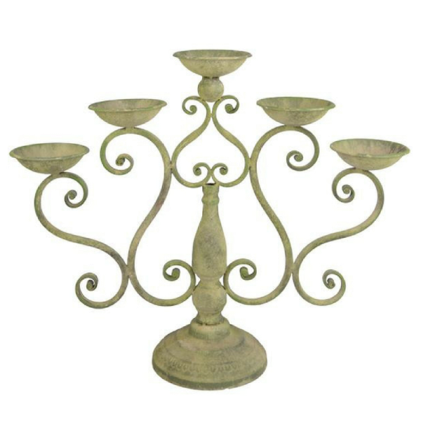 Suport de lumânări, cu 5 brațe, din metal de culoare verde antic. Poate fi o decorațiune de Crăciun sau pentru spații cu aspect rustic. Dimensiuni: înălțime 44 cm, lățime: 53 cm adâncime: 16 cm Grutate: 1,09 kg