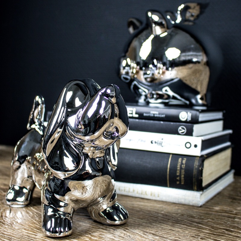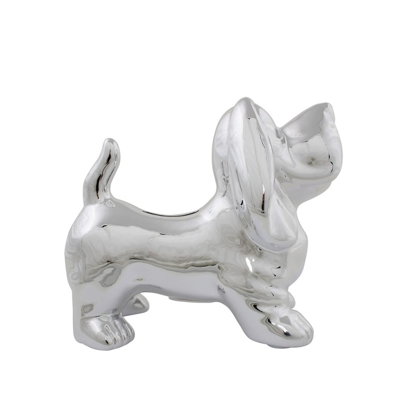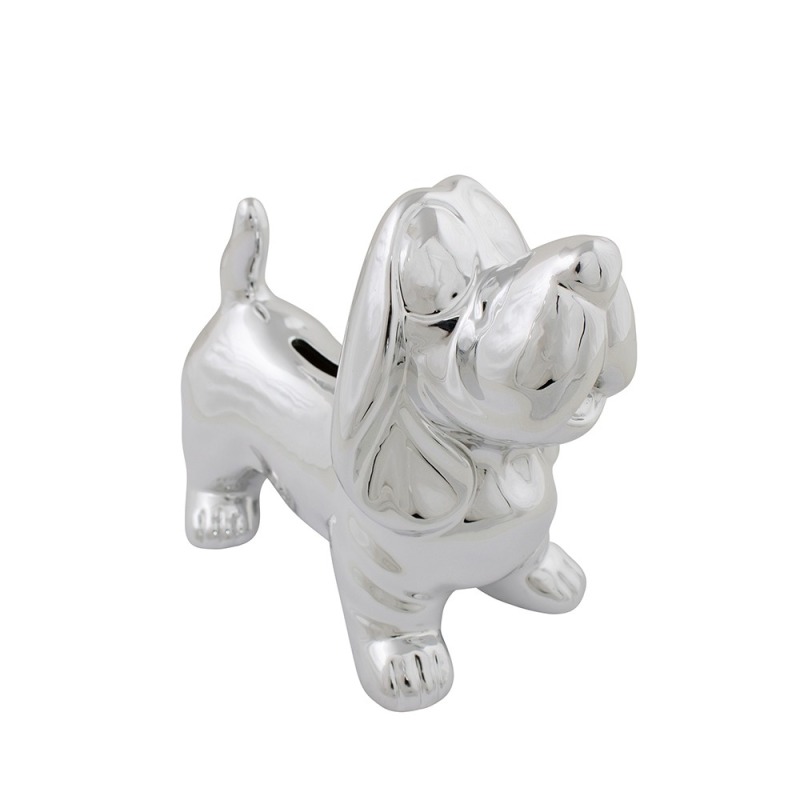 Acest cățeluș pușculită, pe lângă utilitatea practică este și un decor deosebit pentru orice încăpere. Banii pot fi introduși prin partea de sus și scoși pe la bază. Dimensiuni: înălțime 18 cm, lățime 8 cm, lungime 15 cm.