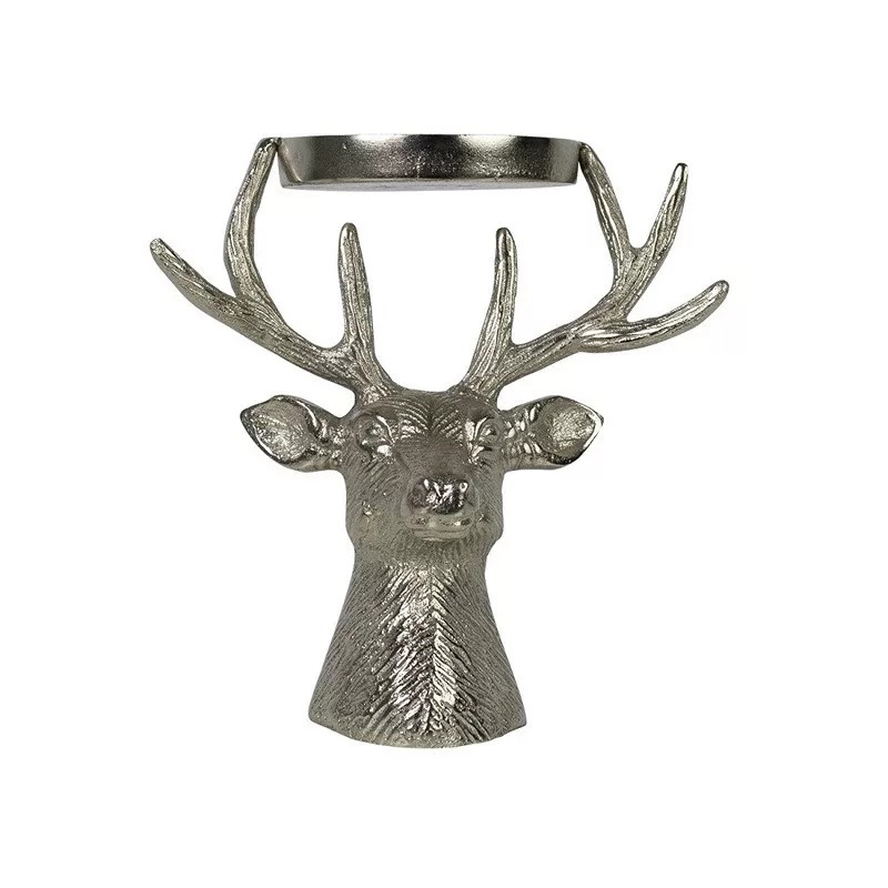 Suportul de lumânări cu cap de cerb de culoare argintie se potrivește atât în locuințele moderne, cât și în cele tradiționale, datorită aspectului său exclusivist. Pe partea de sus a coarnelor se află un suport circular în care poate fi plasată o lumânare cu un diametru de până la 8 cm. Creează o atmosferă festivă și plăcută în orice încăpere. Este stabilă. Înălțime: 17 cm. Lățime: 16 cm. Lungime: 13 cm.