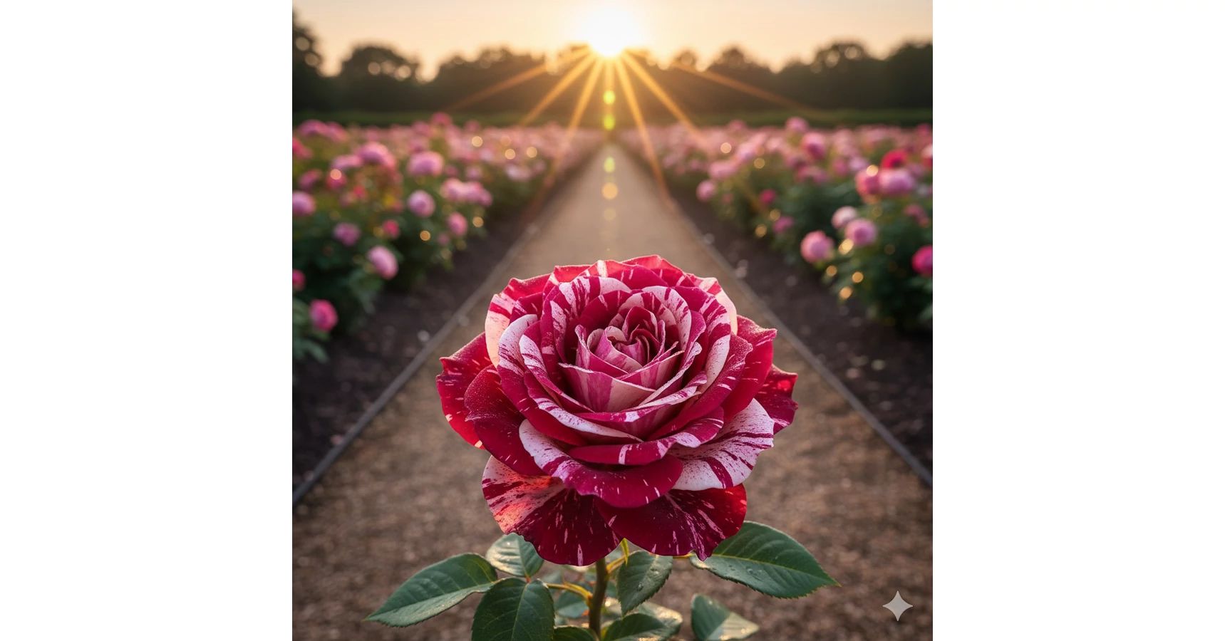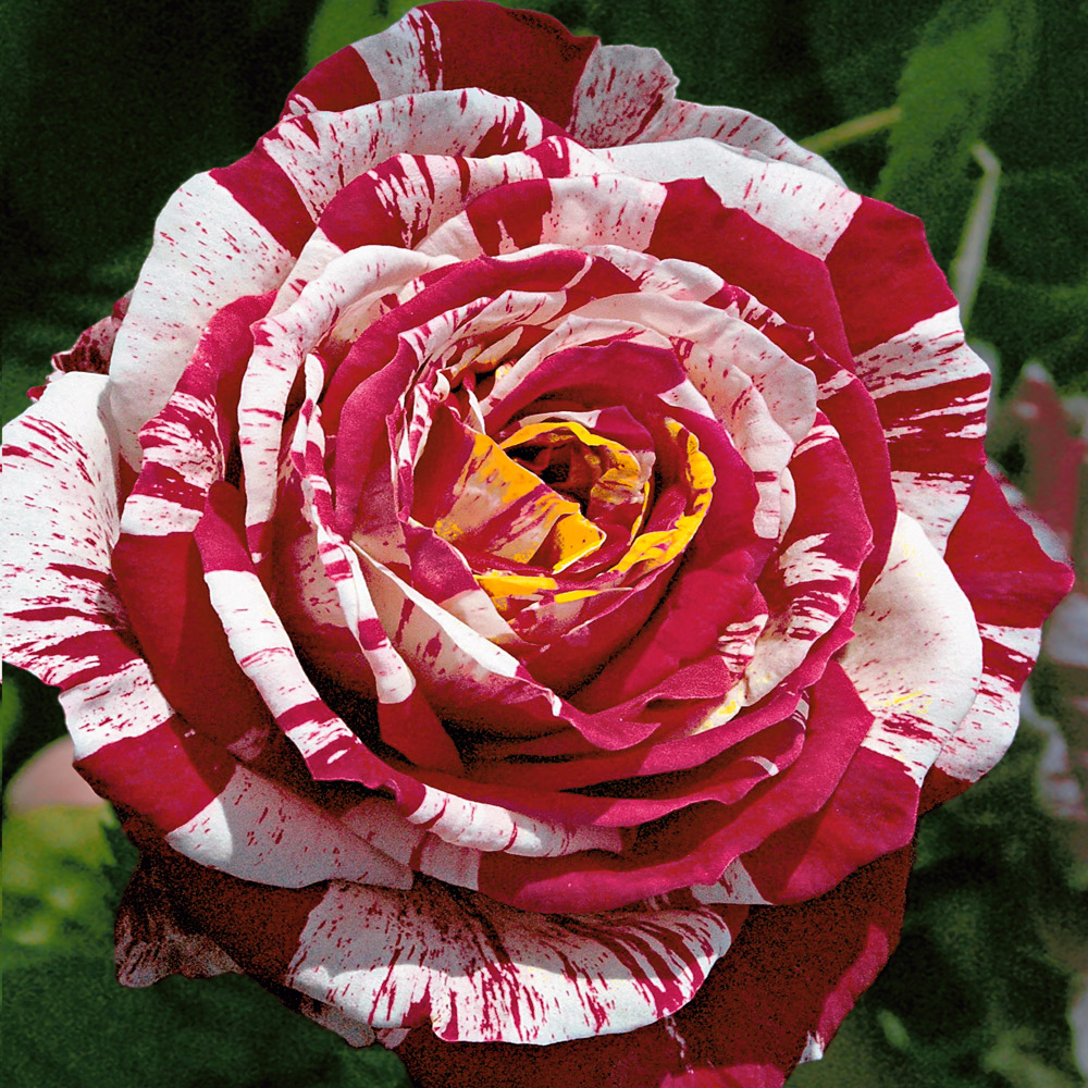 Are flori cu petale dungate în nuanțe de magentă intensă și alb, involte, cu de la începutul verii până toamna târziu. Acest trandafir are înflorire continuă de la începutul verii până târziu în toamnă. Plantă viguroasă, cu tulpini viguroase și sănătoase.